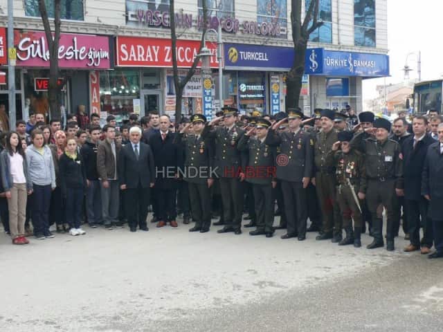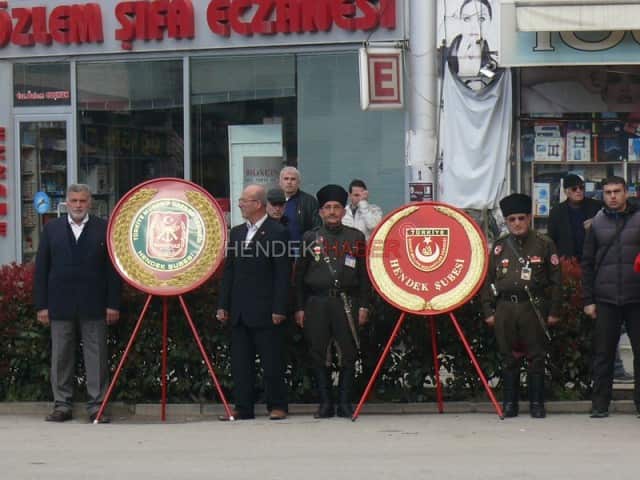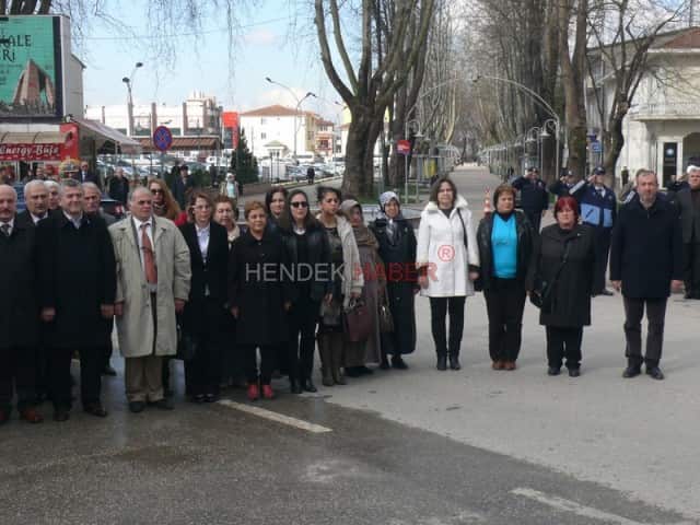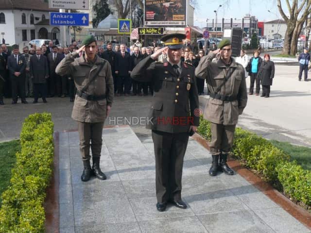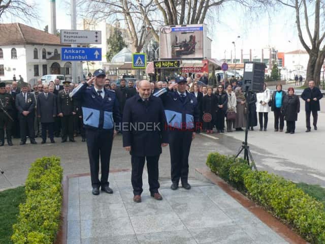 Hendek Cumhuriyet Alanı’nda düzenlenen 18 Mart Şehitleri Anma programında saygı duruşu ve İstiklal Marşı’nın okunmasının ardından çelenk koyuldu.
