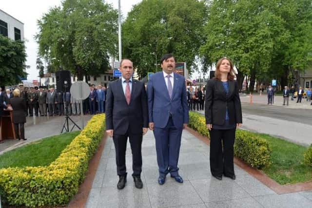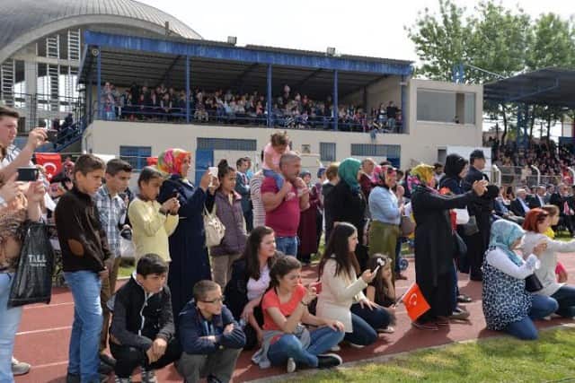 Tören Atatürk Anıtı’na çelenk koyulması ile başladı. Atatürk Stadı’nda yapılan törende, saygı duruşu ve İstiklal Marşı’nın okunmasının ardından Kaymakam İdris Akbıyık, Garnizon Komutan Yzb. Umut Aşık ve Belediye Başkanı İrfan Püsküllü tüm okulları ve halkı selamladı.