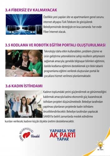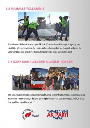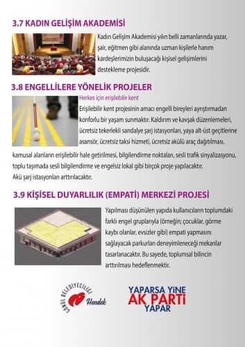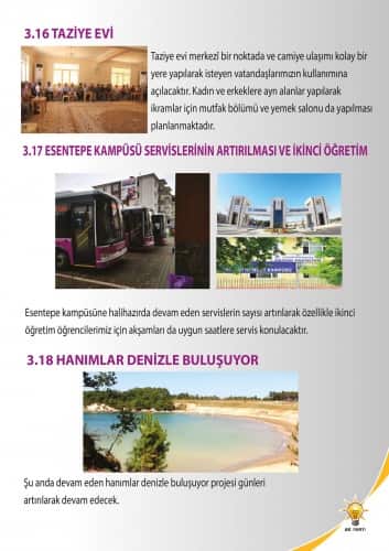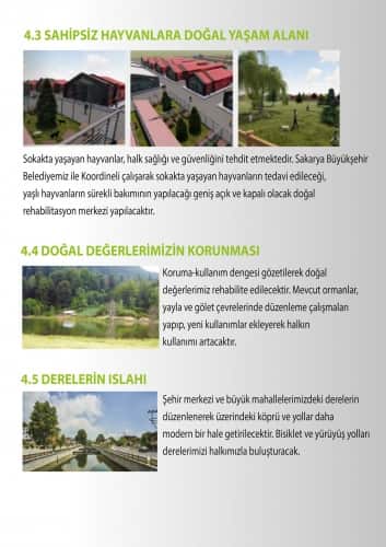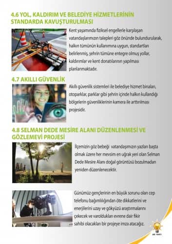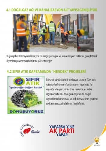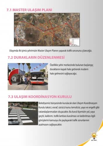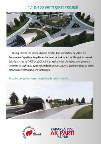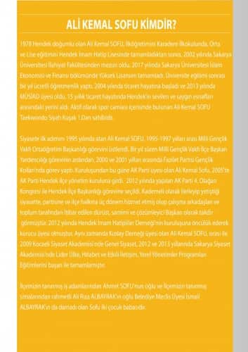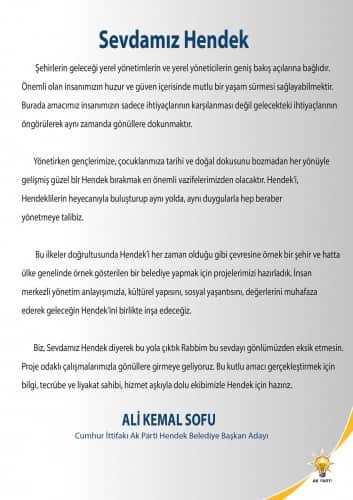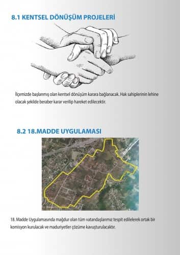 Cumhur İttifakı Ak Parti Belediye Başkan Adayı Ali Kemal Sofu tarafından 2019 - 2024 yılları arasında yapılması planlanan ve seçim beyannamesinde yer alan projeler 8 ana maddeye bölümlendirilerek sunuldu.
