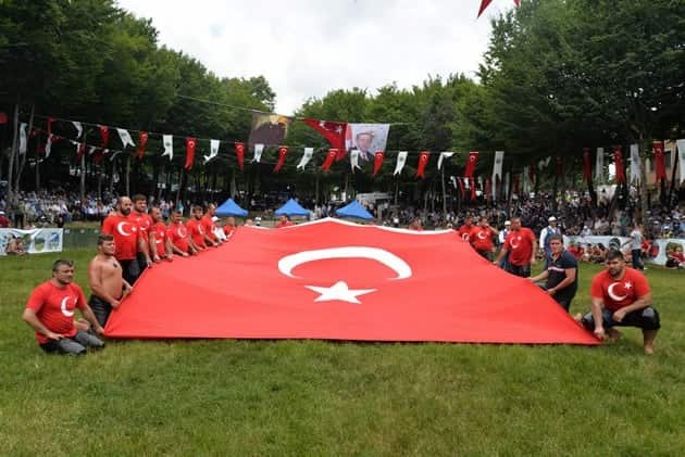 Başpehlivanlar Cumhurbaşkanı Recep Tayyip Erdoğan’ın okuduğu Arif Nihat Asya’nın DUA şiiri ve dev Türk bayrağı ile er meydanına inerek halkı selamlamaları vatandaşlardan büyük alkış alırken coşku doruğa çıktı.