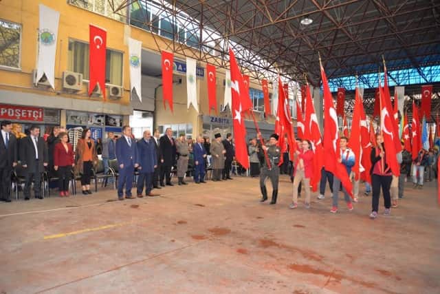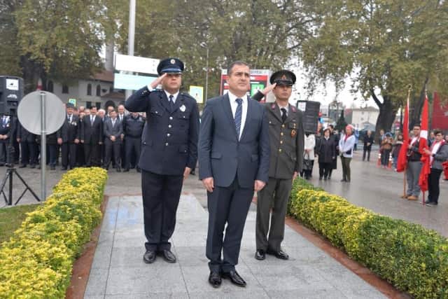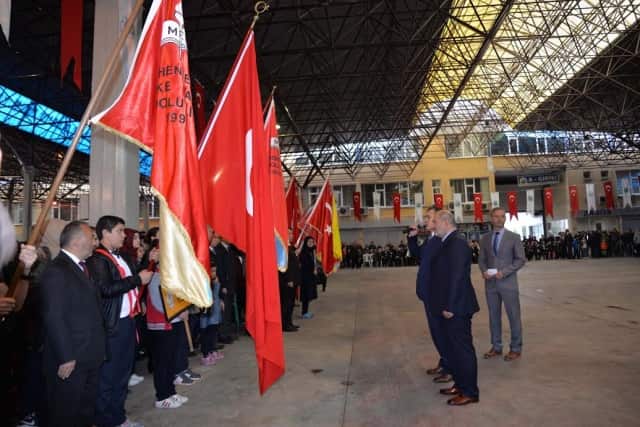 Saygı Duruşu ve İstiklal Marşı’nın okunmasının ardından Kaymakam İdris Akbıyık ve Belediye Başkanı İrfan Püsküllü, öğrencileri ve halkı selamladı.