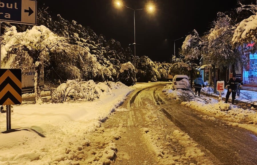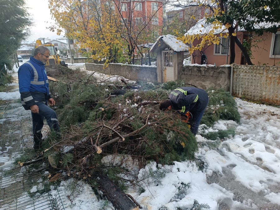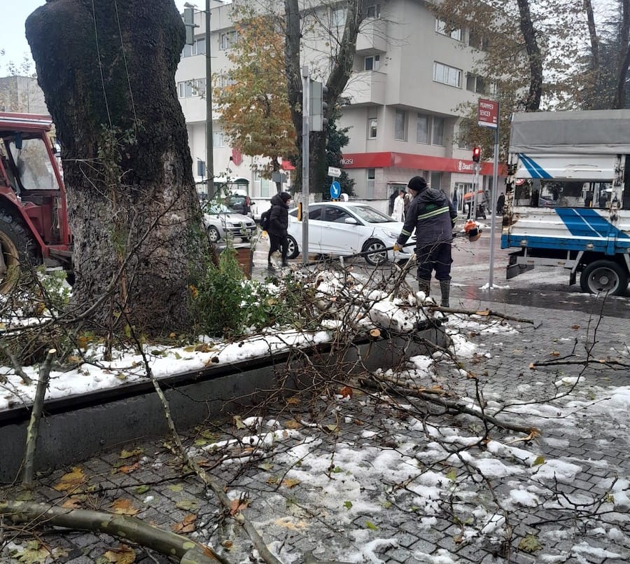 Kar küreme araçlarıyla yolları açık tutmaya çalışan ekipler, özellikle yüksek kesimlerdeki mahalleler, ana arterler, hastane yolları ve okul güzergahlarında çalışmalarını aralıksız sürdürüyor. Tehlike oluşturan ağaçların budanarak bertaraf edildiği belirtilirken, Meteoroloji Genel Müdürlüğü’nden gelen uyarılar doğrultusunda ekiplerin faaliyetlerini yönlendirdiği ifade edildi.