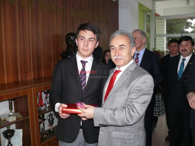 Ensar KOÇ´un hediyesi İlçemize tablet dağıtım töreni için gelen Sakarya Valisi Sayın Mustafa BÜYÜK tarafından verildi. Okul tarafından hazırlanan Kur’anı Kerim ve Cumhuriyet altınını öğrenciye takdim eden Sakarya Valisi Sayın Mustafa BÜYÜK ; “ Bu Hendek her zaman her yerde her oluşumda birinciliği kimseye bırakmıyor. Sizleri ve öğrencimizi tebrik ediyorum” diyerek öğrenciyi yanaklarından öptü ve başarılarının devamını diledi.
