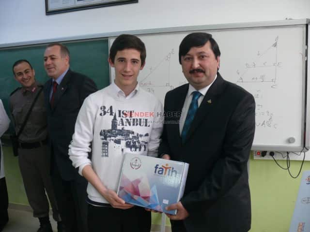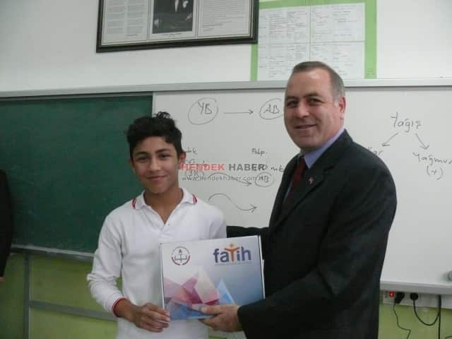 Hendek İlçe Emniyet Müdürü Metin Çetger Fatih Projesi kapsamında öğrenciye tablet takdime derken.