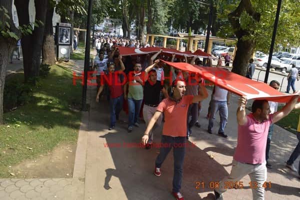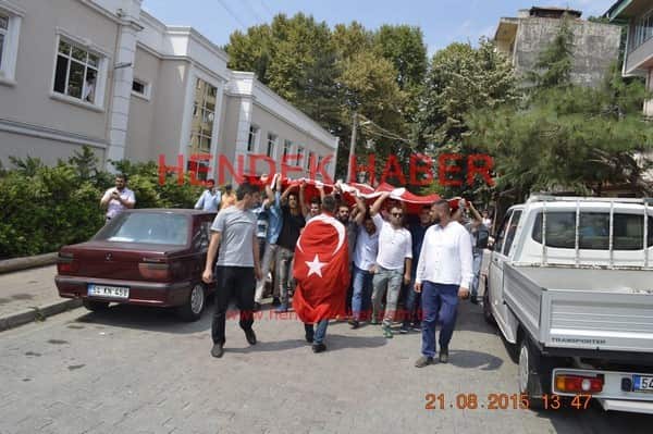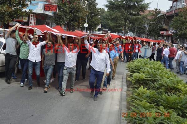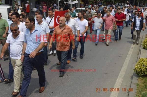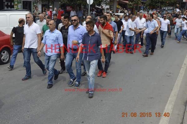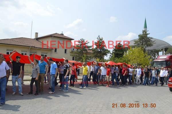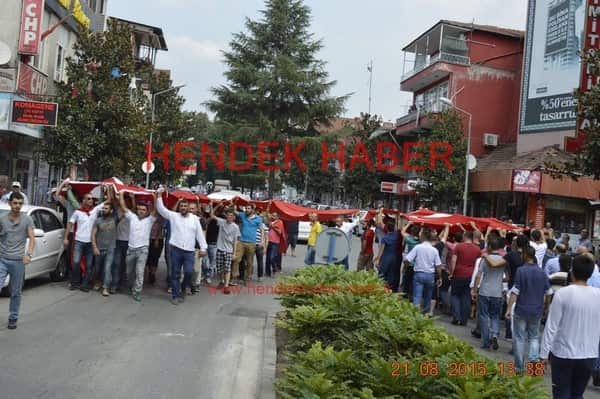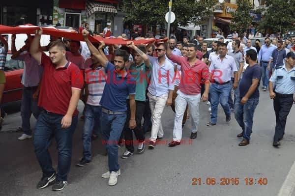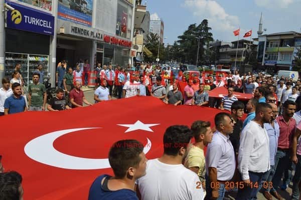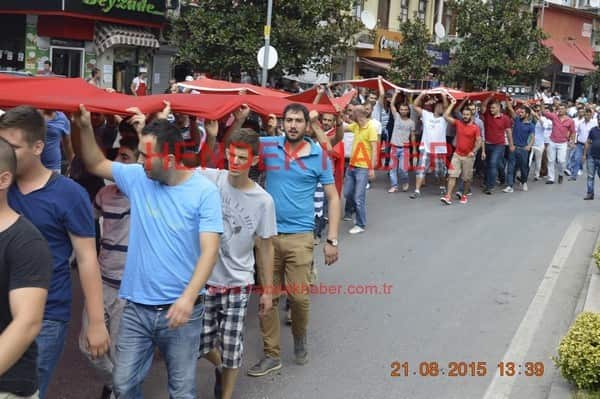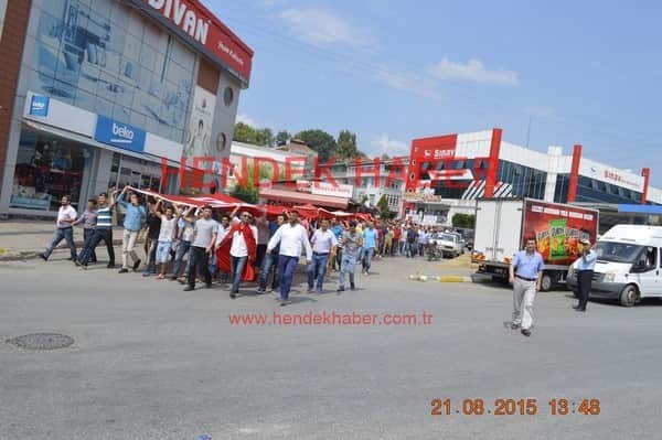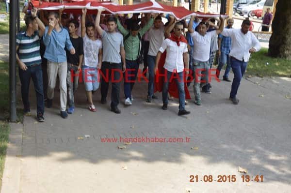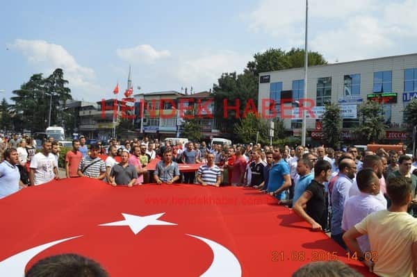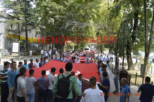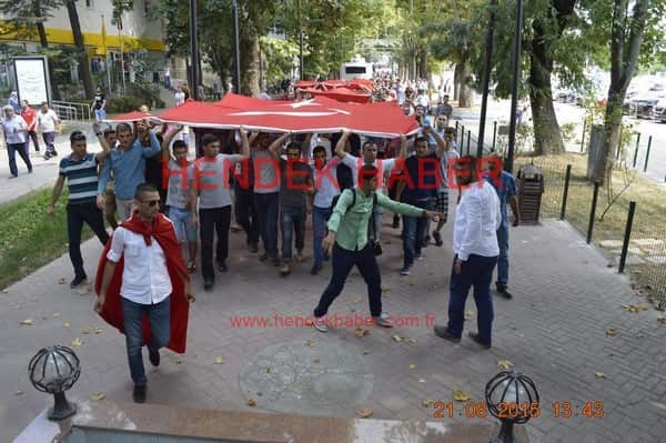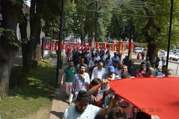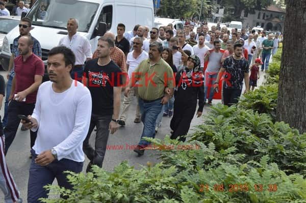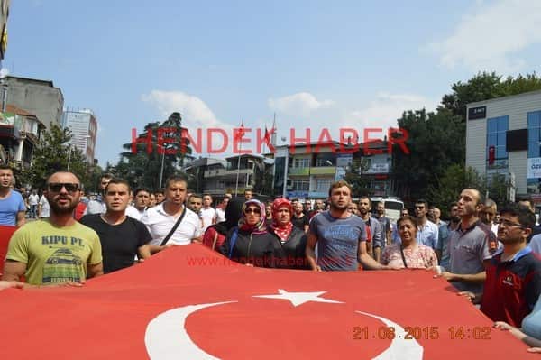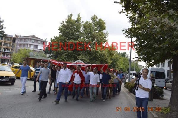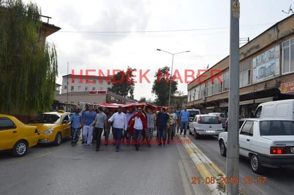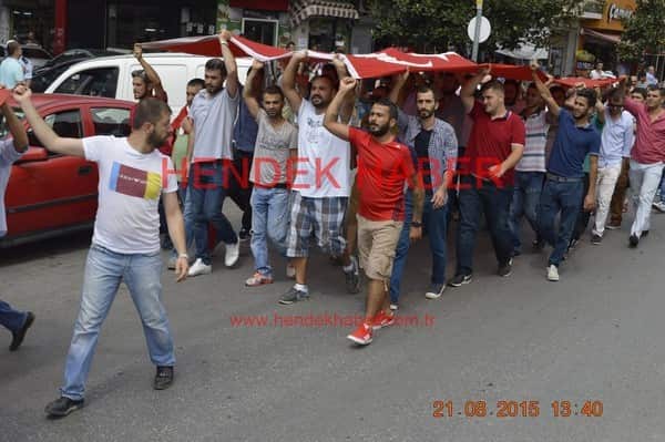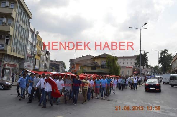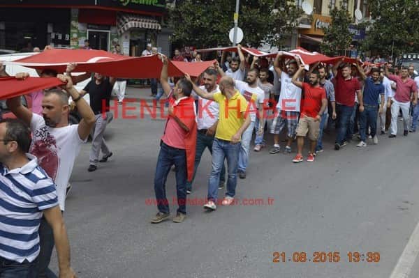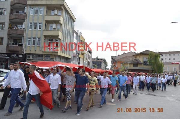 Hendek ilçesinde faaliyet gösteren siyasi parti temsilcilerinin yanı sıra, çeşitli oda başkanları ve gençlik kolları başkanlarının da katıldığı yürüyüşte, bayraklar açıldı, lanetler okundu.