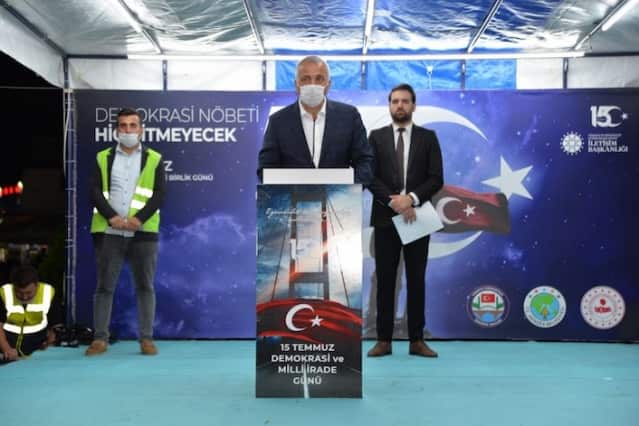 15 Temmuz Demokrasi ve Milli Birlik Günü’nün önemine vurgu yapan Hendek Kaymakamı Halil İbrahim Acır “Tarih boyunca istiklal ve bağımsızlığımızın Milli birlik ve beraberliğimizin bu uğurda büyük bedeller ödeyen aziz milletimiz hiçbir zaman esaret altında yaşamayı kabul etmemiş, aziz bildiği kutsal vatan topraklarını canı ve kanı pahasına korumayı bilmiştir. 15 Temmuz 2016 tarihinde FETÖ tarafından gerçekleştirilen alçak darbe girişimine karşı aziz milletimiz, kadını erkeği yaşlısı genci ile canını ortaya koyarak kendi iradesine ve özgürlüğüne yapılan bu haince darbe girişimine karşı dimdik duruş sergileyerek yeniden bir dirilişe imza atmıştır. Milletimiz 15 Temmuz gecesi cesaretiyle, dirayetiyle kararlı ve dik duruşuyla bu ülkeyi bölmek isteyen saldırganlara karşı Çanakkale’de Sakarya’da Dumlupınar’da ne cevap vermişse 15 Temmuzda da aynı cevabı vermiştir. Tarihin her döneminde olduğu gibi bundan sonrada tek yürek olmayı başarmak, bu ülke vatandaşları olarak vatanımıza, milletimize, bayrağımıza ve devletimize sahip çıkmak zorundayız.” dedi.