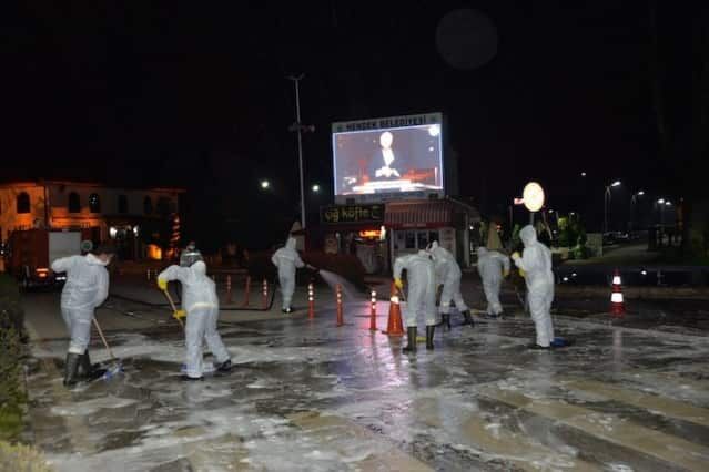 Koronavirüs tedbirlerini elden bırakmayan Hendek Belediyesi, yaptığı çalışmalara bir yenisini daha ekleyerek gece yarısı cadde ve sokakları köpüklü suyla yıkadı ve ardından ilaçladı.