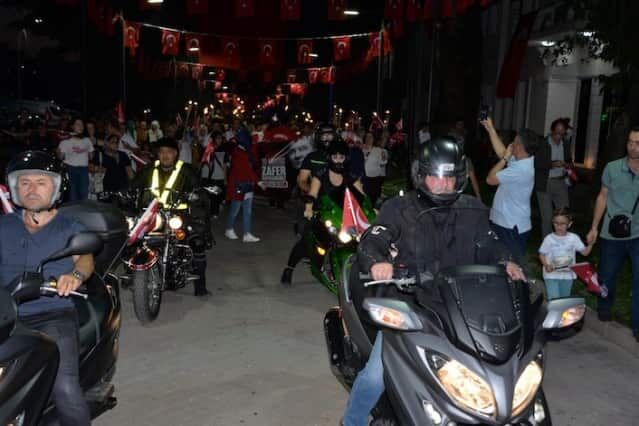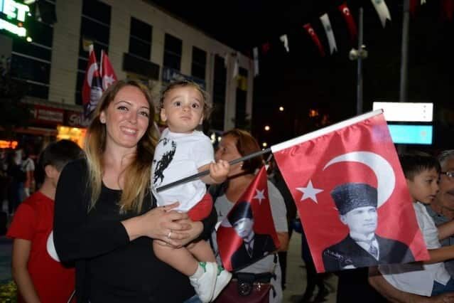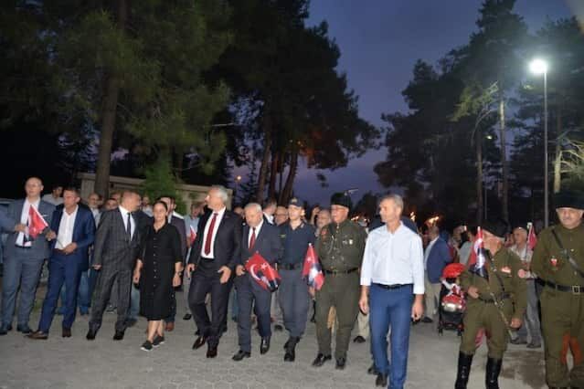 İlçe Jandarma Komutanlığı önünden başlayan yürüyüşte vatandaşlara binlerce Türk Bayrağı dağıtılırken, büyük zaferin 97.yılında 97 metre uzunluğunda Türk Bayrağı korteji yapıldı. Gaziler yürüyüşte büyük ilgiyle alkış alırken, motosikletliler ise Fener Alayına ayrı bir güzellik kattı. Dev Türk Bayrağı ve Atatürk posterleri taşıyan her yaştan ve branştan sporcular da Fener Alayının yıldızı oldu.