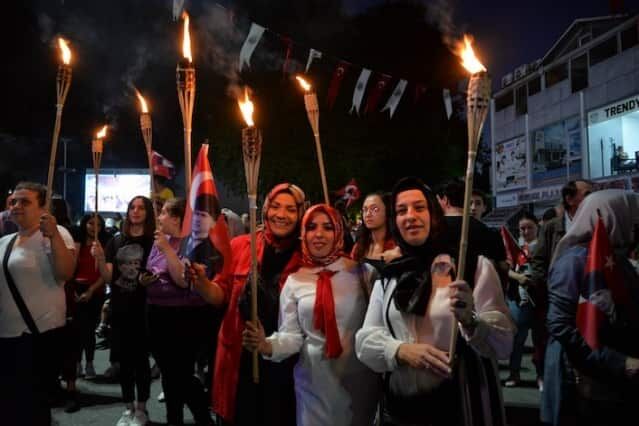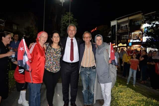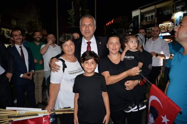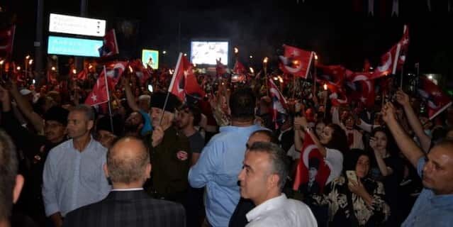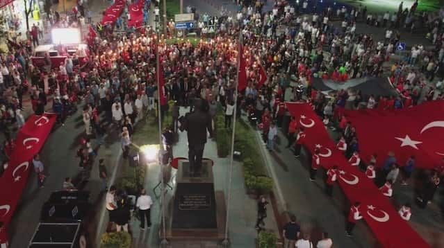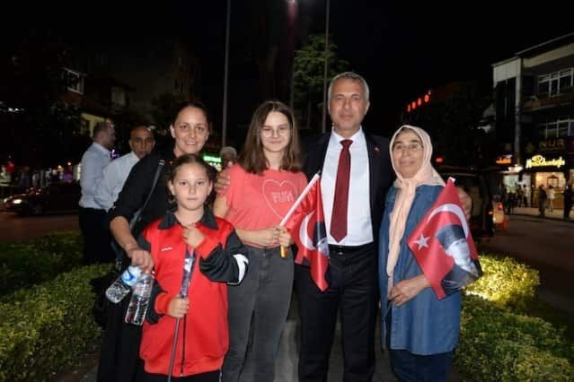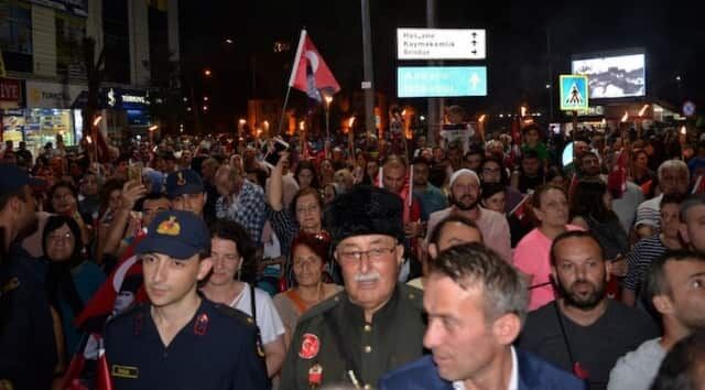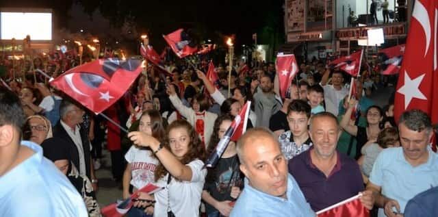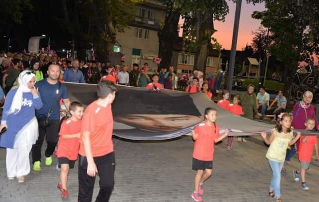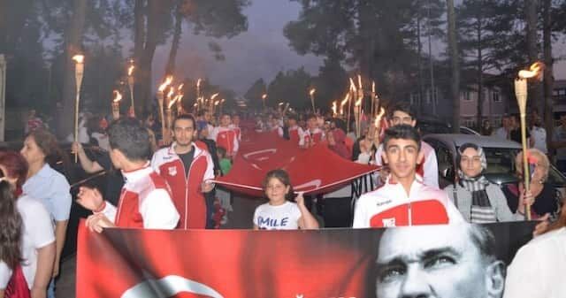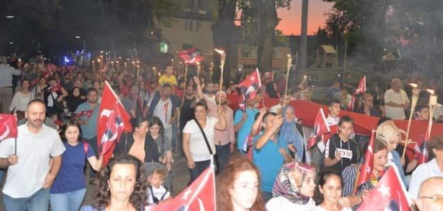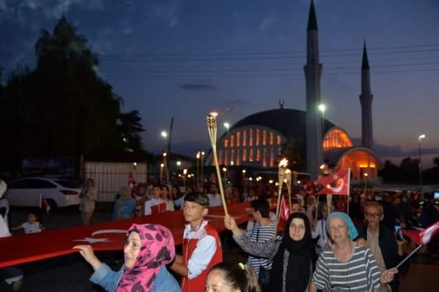 Yakılan meşalelerle başlayan yürüyüş, binlerce kişinin katılımıyla Hendek merkezinde büyük coşkuya sahne oldu. Kortej bayrağını taşıyan sporcular, ‘Ne Mutlu Türküm diyene’, ‘Şehitler Ölmez Vatan Bölünmez’, ‘Türkiye’ ve ‘Vatan sana canım feda’ sloganları attı. Yürüyüş Muammer Sencer Caddesinden devam ederek Cumhuriyet Meydanında son buldu.