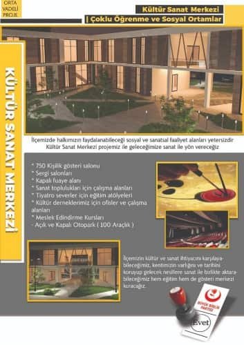 İlçemiz halkımızın faydalanabileceği sosyal ve sanatsal faaliyet alanları yetersizdir Kültür Sanat Merkezi projemiz ile geleceğimizi sanat ile yön vereceğiz.