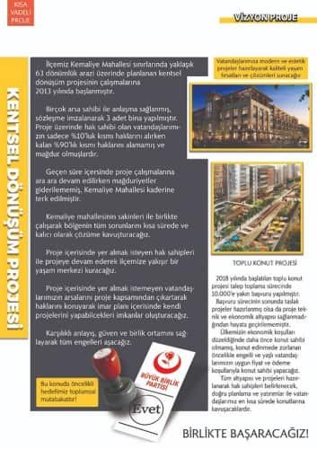Proje içerisinde yer almak istemeyen vatandaşlarımızın arsalarını proje kapsamından çıkartarak haklarını koruyarak imar planı içerisinde kendi projelerini yapabilecekleri imkanlar oluşturacağız.