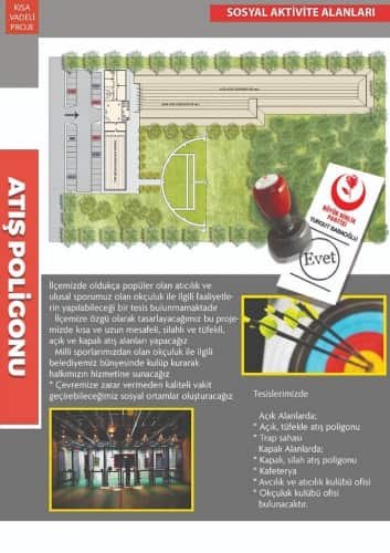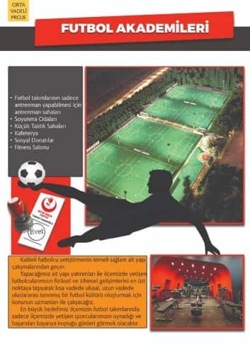 Yapacağımız altyapı yatırımları ile ilçemizde yetişen futbolcularımızın fiziksel ve zihinsel gelişimlerini en üst noktaya taşıyarak kısa vadede ulusal, uzun vadede uluslararası tanınmış bir futbol kültürü oluşturmak için konunun uzmanları ile çalışacağız.