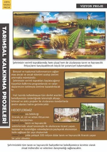 Şehrimizin verimli toprakları; başlatacağımız topyekün kalkınma programlarıyla ve vatandaşlarımızın katılımıyla üretime kazandırılacaktır.