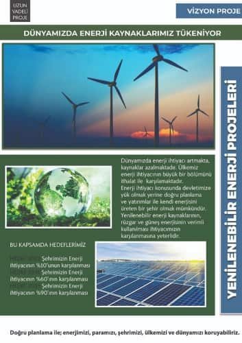 Dünyamızda enerji ihtiyacı artmakta, kaynaklar azalmaktadır. Ülkemiz enerji ihtiyacının büyük bir bölümünü ithalat ile karşılamaktadır. Enerji ihtiyacı konusunda devletimize yük olmak yerine doğru planlama ve yatırımlar ile kendi enerjisini üreten bir şehir olmak mümkündür. Yenilenebilir enerji kaynaklarının, rüzgar ve güneş enerjisinin verimli kullanılması ihtiyacımızın karşılanmasına yeterlidir..