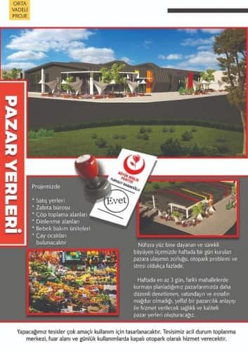 Haftada en az 3 gün farklı mahallelerde kurmayı planladığımız pazarları mızda daha düzenli denetlenen vatandaşın ve esnafın mağdur olmadığı şeffaf bir pazarcılık anlayışı ile hizmet verecek sağlıklı ve kaliteli pazar yerleri oluşturacağız.