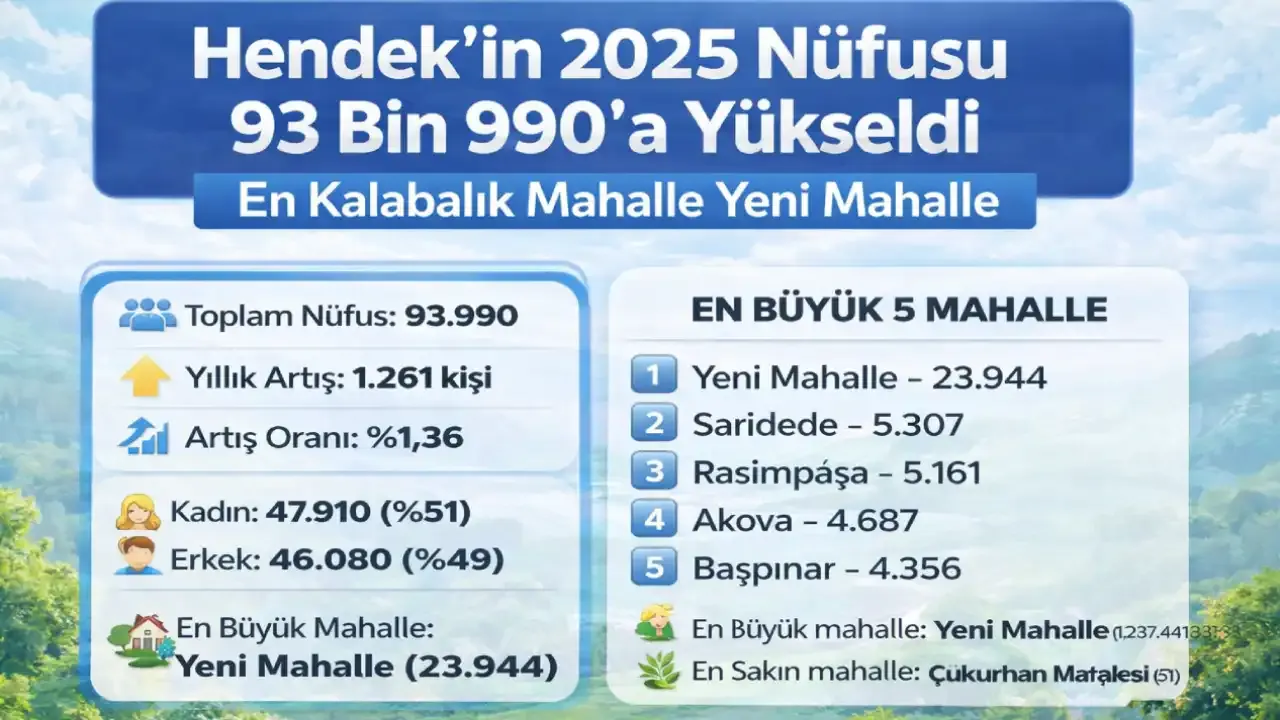 2025 yılı verileriyle birlikte ilçe nüfusunun 94 bine yaklaşması, Hendek’in bölgesel gelişimini sürdüğünü bir kez daha ortaya koydu.