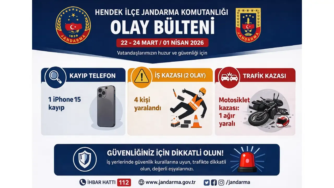 Hendek İlçe Jandarma Komutanlığı sorumluluk sahasında farklı tarihlerde meydana gelen iş kazalarında toplam 4 kişi yaralandı.